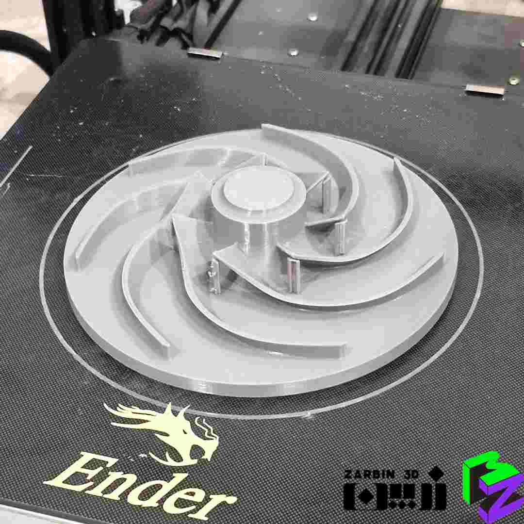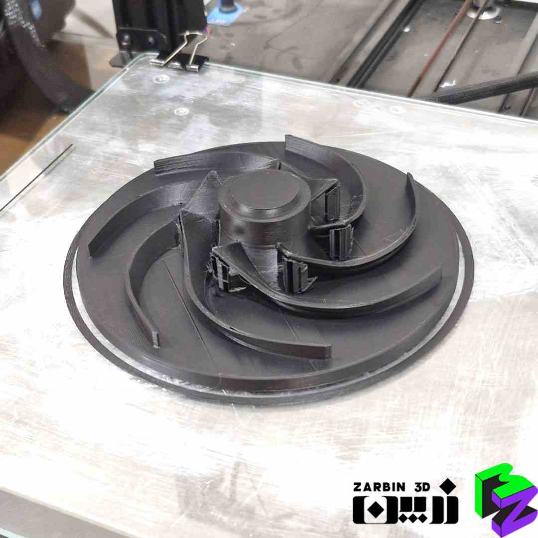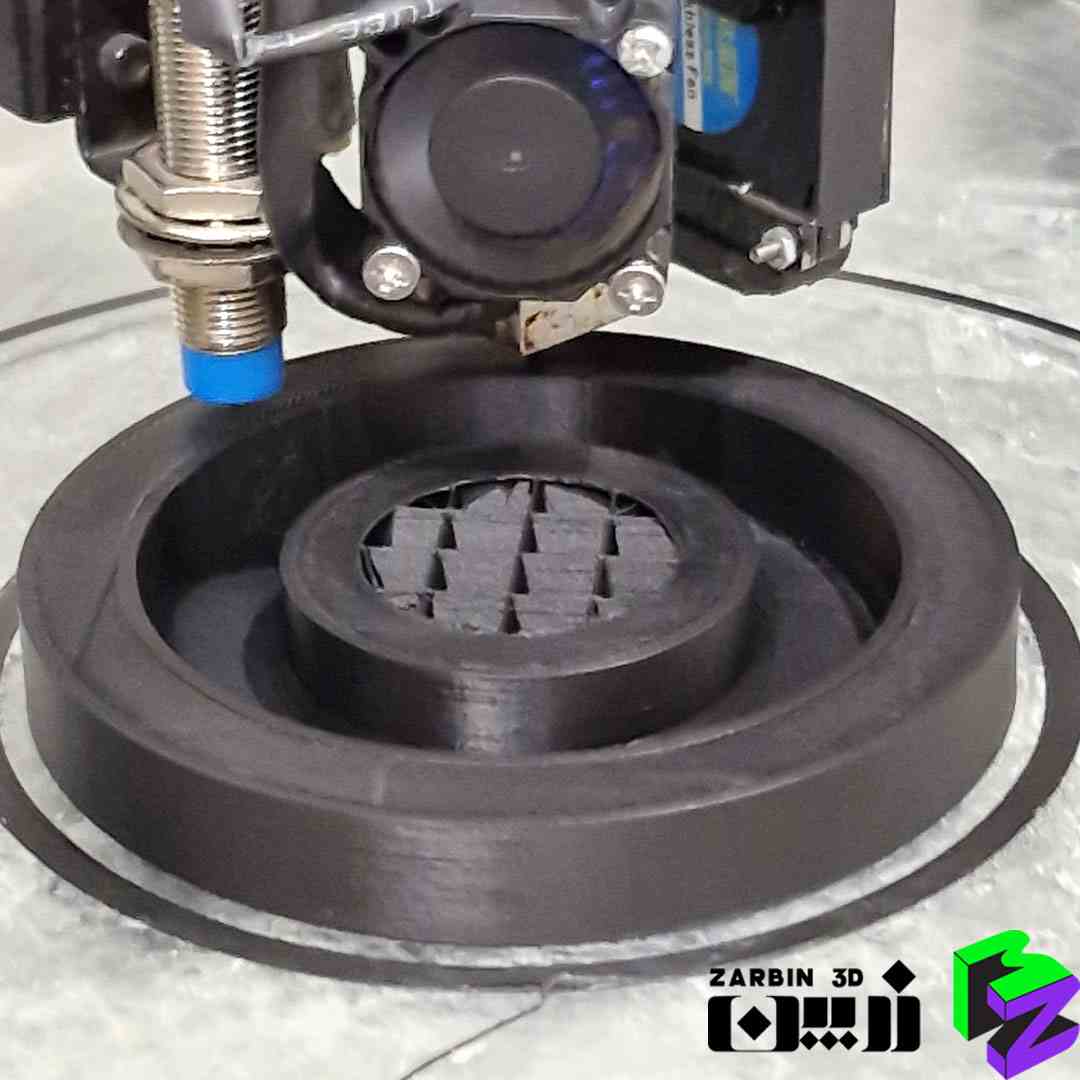به دلیل وجود سطح کفی غیر صاف و اهمیت کیفیت آن، امکان چاپ یکتکه وجود نداشت؛ زیرا سطح زیرین قطعه دارای قوس بود و در صورت چاپ یکپارچه، این قوس دقیقاً زیر ساپورت قرار میگرفت و باعث افت شدید کیفیت سطح میشد. بنابراین قطعه بهصورت دو تکه چاپ شد و با خارهای دقیق به یکدیگر متصل گردید تا هم کیفیت سطحی حفظ شود و هم هندسه نهایی کاملاً یکپارچه باشد.