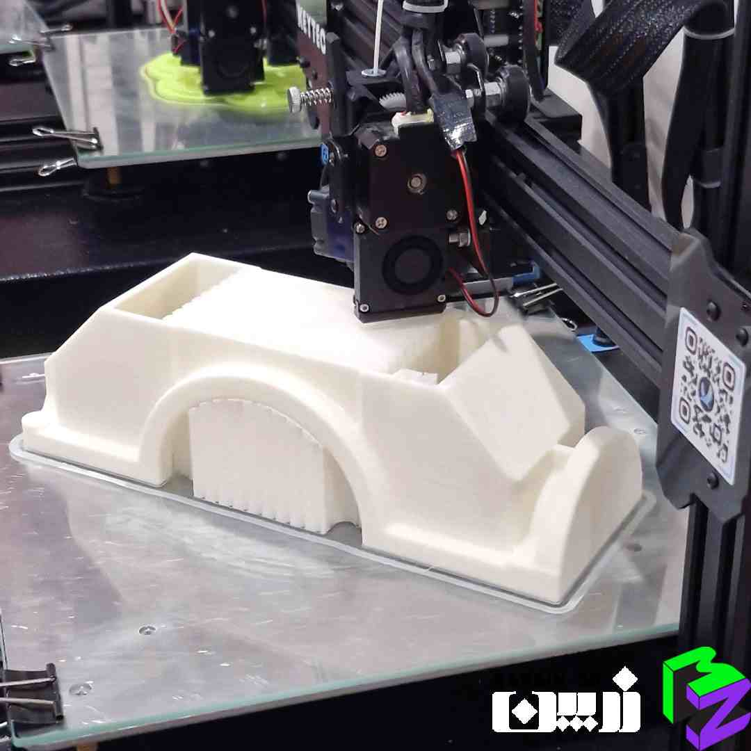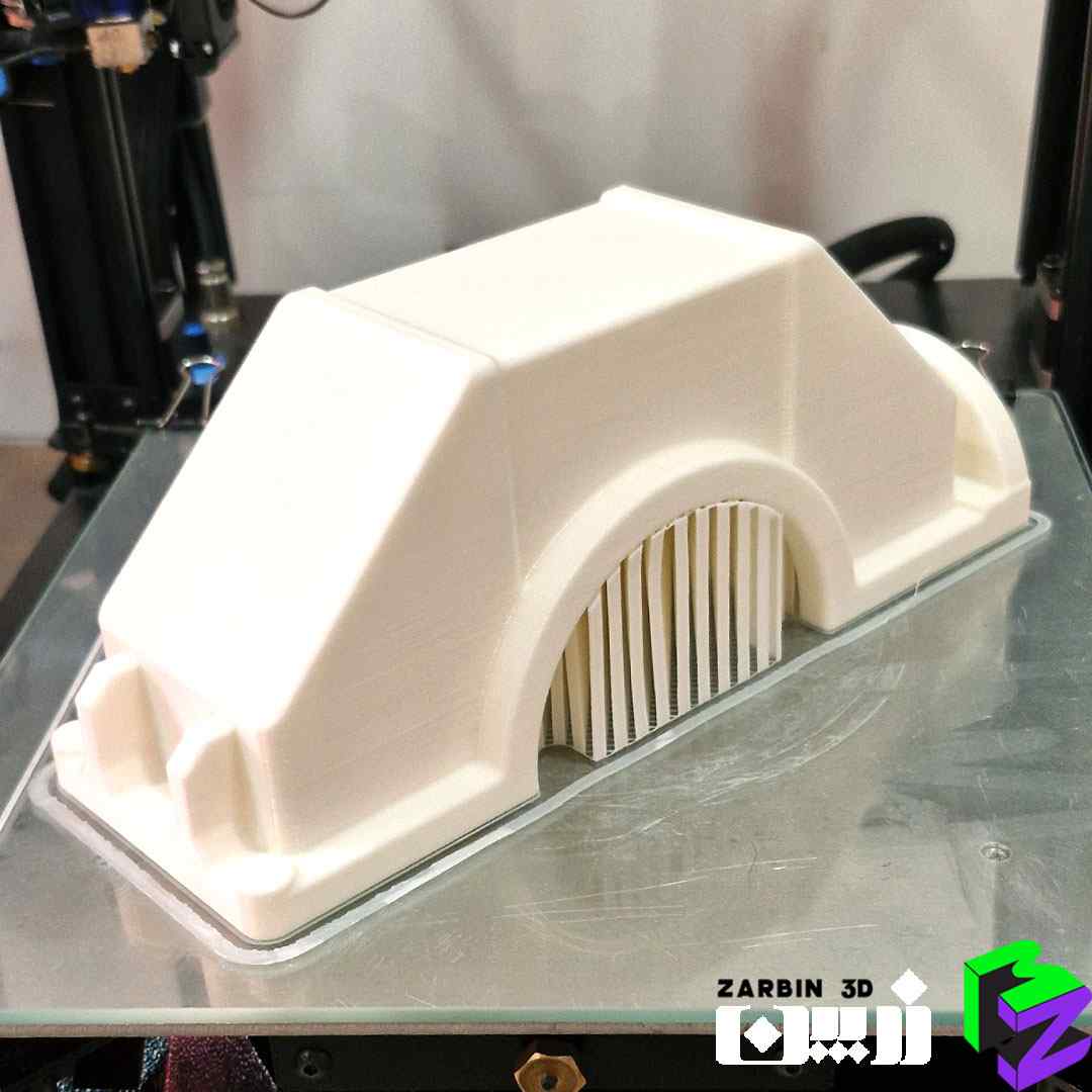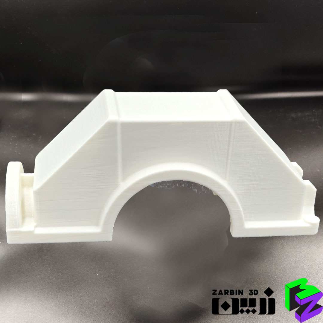به دلیل وجود سطح کفی فوقانی صاف و اهمیت کیفیت آن، امکان چاپ یکتکه وجود نداشت؛ زیرا سطح زیرین قطعه دارای قوس بود و در صورت چاپ یکپارچه، این قوس دقیقاً زیر ساپورت قرار میگرفت و باعث افت شدید کیفیت سطح میشد. بنابراین قطعه بهصورت دو تکه چاپ شد و با خارهای دقیق به یکدیگر متصل گردید تا هم کیفیت سطحی حفظ شود و هم هندسه نهایی کاملاً یکپارچه باشد.